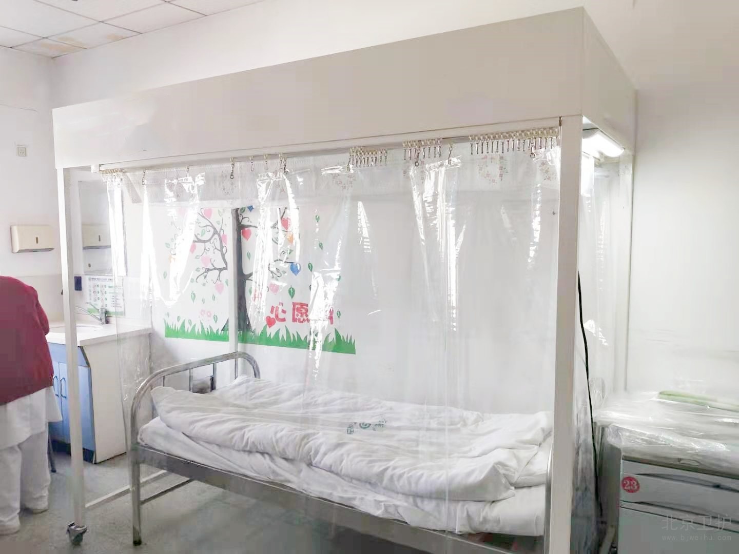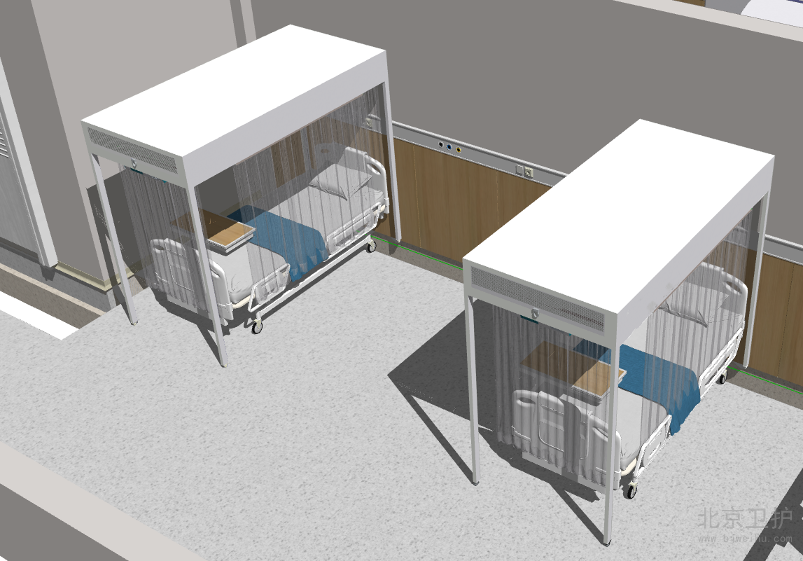 層流床罩(百級層流罩)又名層流床、單人無菌室、移動層流罩等,將低免疫力病人連病床一起罩于潔凈層流床罩內,從而起到降低感染的作用。起凈化作用的主要是層流床罩部分,可選配病床。